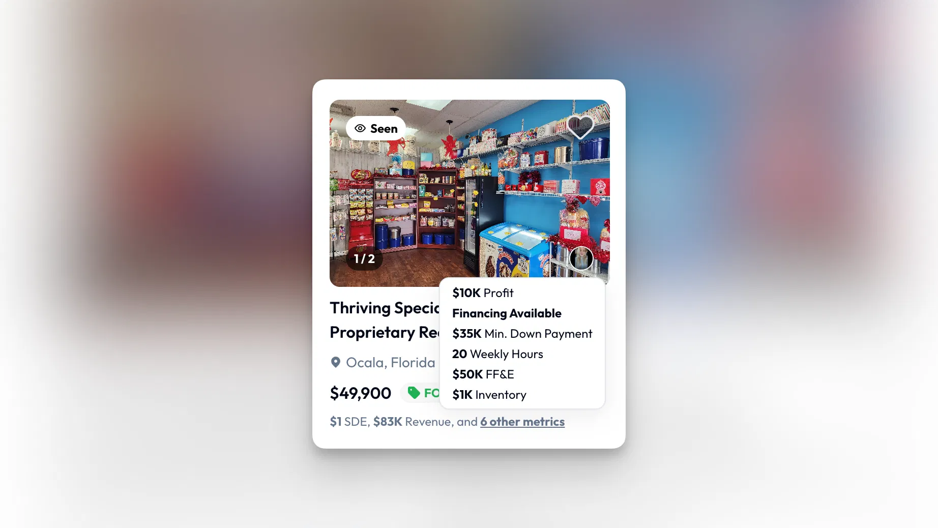 Our new listing cards are smart. Instead of showing empty fields, they now automatically display the two most important highlights for each business, like its earnings or financing options.