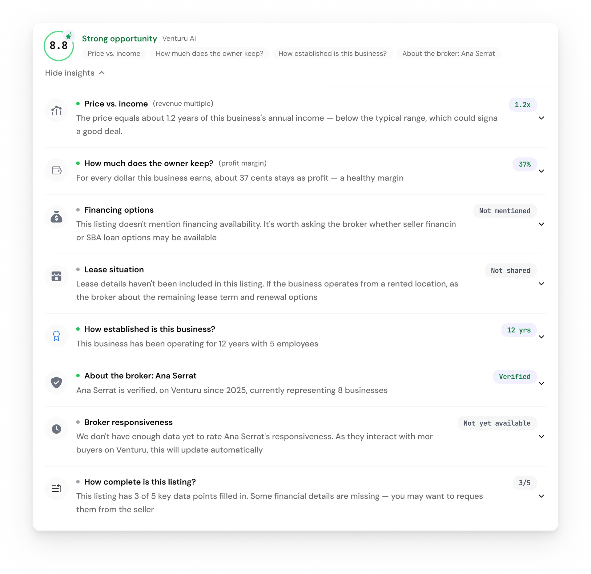 Every listing on Venturu now comes with AI-powered insights — a plain-English explanation of the key data points that help a buyer understand the opportunity. Think of it as the conversation a good broker would have with a buyer before the first call, happening automatically, at scale.