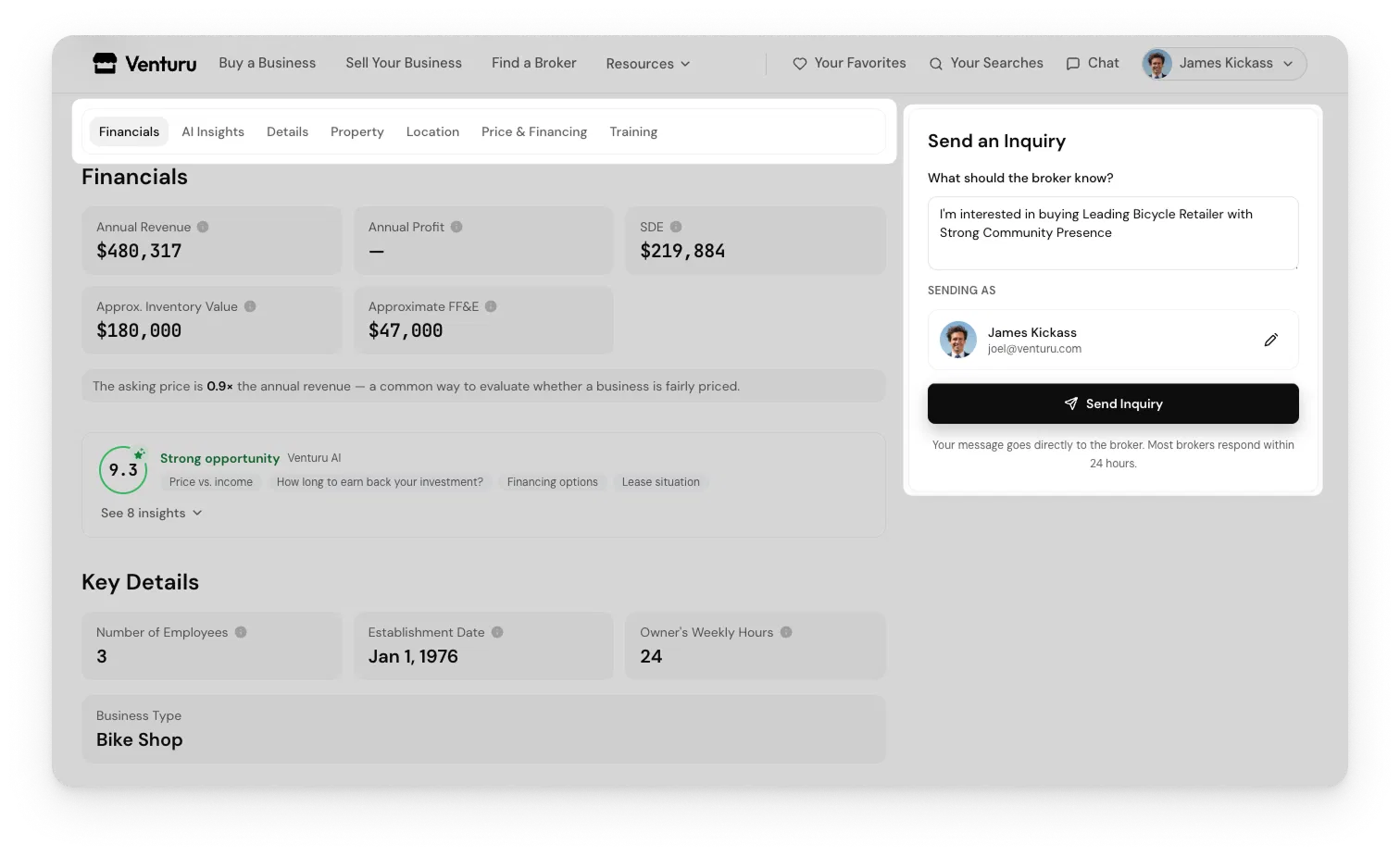 We restructured how information is presented too. Financial data is scannable at a glance — revenue, profit, asking price, and the revenue multiple all in a clean grid. SBA pre-qualification and financing terms are surfaced prominently, not buried in paragraph text.